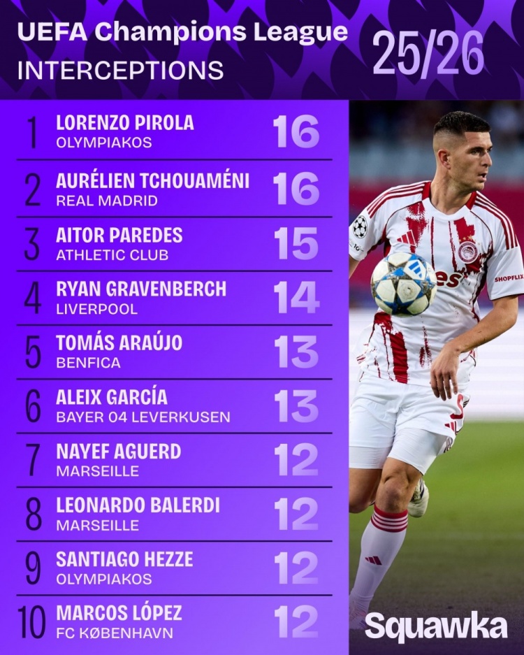 1月23日讯 Squawka统计了球员本赛季欧冠的拦截次数,并列出榜单,琼阿梅尼、皮罗拉16次居首。本赛季欧冠拦截排名:皮罗拉(奥林匹亚科斯)——16琼阿梅尼(皇家马德里)——16艾托·帕雷德斯(毕尔巴鄂竞技)——15赫拉芬贝赫(利物浦)——14托马斯·阿劳霍(本菲卡)——13阿莱克斯·加西亚(勒沃库森)——13阿格德(马赛)——12巴列尔迪(马赛)——12...